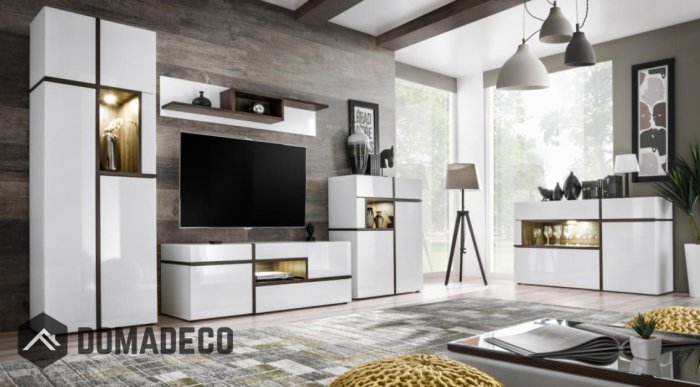 Vitrina Alta: En la parte central, agujero abierto con iluminación LED blanca. En las 2 puertas superiores, detrás de ellas 1 agujero. En el lado derecho, puertas, detrás de ellas 3 estantes. En lado izquierdo, puertas, detrás de ellas 2 estantes. Mesa de TV: Agujero abierto con luz LED blanca. El cajón tiene extensión completa. 2 puertas, detrás de cada una hay un agujero. Vitrina baja: en la parte central hay un agujero con luz LED blanca.