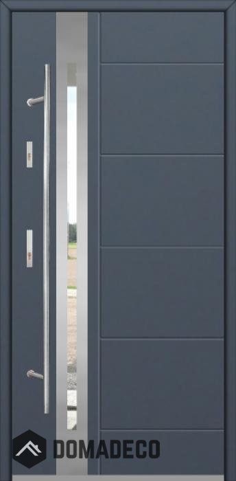 La puerta es de acero inoxidable. En el interior está rellena de espuma de poliuretano PUR y madera. El grosor de la hoja de la puerta es de 64 mm. Sistema de sellado dual: Un sello está en la parte inferior del marco y el otro está ubicado en la parte de soporte de la hoja de la puerta. Reducen la vibración y protegen su casa de la pérdida de calor. No cambian su volumen bajo la influencia de las condiciones atmosféricas. El marco de la puerta tiene refuerzos antirrobo en piezas de bisagra y puntos de bloqueo.