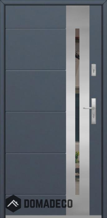 La puerta es de acero inoxidable. En el interior está rellena de espuma de poliuretano PUR y madera. El grosor de la hoja de la puerta es de 64 mm. Sistema de sellado dual: Un sello está en la parte inferior del marco y el otro está ubicado en la parte de soporte de la hoja de la puerta. Reducen la vibración y protegen su casa de la pérdida de calor. No cambian su volumen bajo la influencia de las condiciones atmosféricas. El marco de la puerta tiene refuerzos antirrobo en piezas de bisagra y puntos de bloqueo.