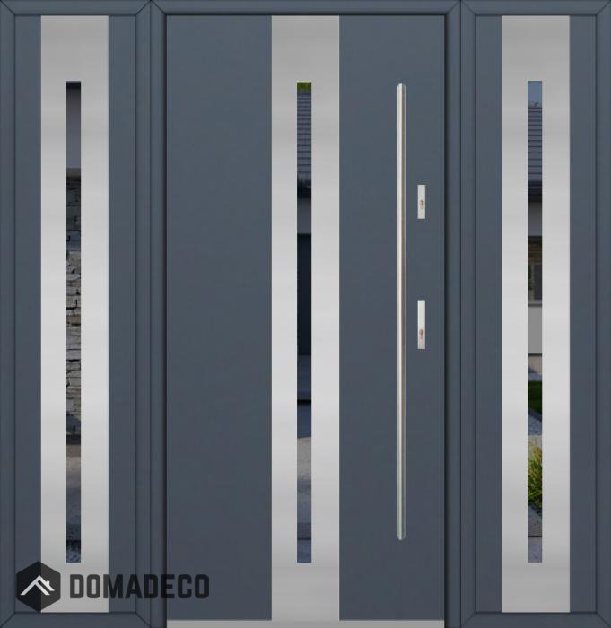 La puerta es de acero inoxidable. En el interior está rellena de espuma de poliuretano PUR y madera. El grosor de la hoja de la puerta es de 54 mm. Sistema de sellado dual: Un sello está en la parte inferior del marco y el otro está ubicado en la parte de soporte de la hoja de la puerta. Reducen la vibración y protegen su casa de la pérdida de calor. No cambian su volumen bajo la influencia de las condiciones atmosféricas. El marco de la puerta tiene refuerzos antirrobo en piezas de bisagra y puntos de bloqueo.