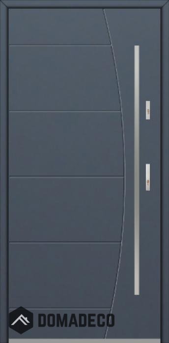 La puerta es de acero inoxidable. En el interior está rellena de espuma de poliuretano PUR y madera. El grosor de la hoja de la puerta es de 64 mm. Sistema de sellado dual: Un sello está en la parte inferior del marco y el otro está ubicado en la parte de soporte de la hoja de la puerta. Reducen la vibración y protegen su casa de la pérdida de calor. No cambian su volumen bajo la influencia de las condiciones atmosféricas. El marco de la puerta tiene refuerzos antirrobo en piezas de bisagra y puntos de bloqueo.