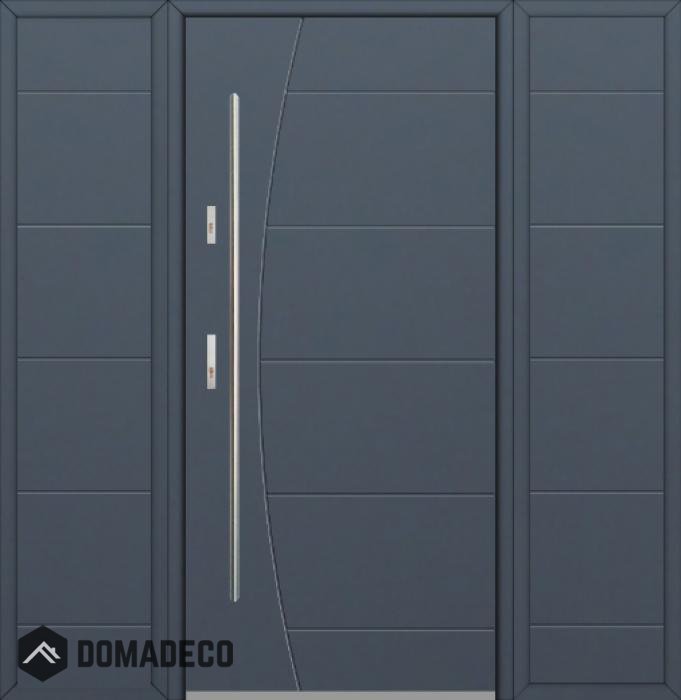 La puerta es de acero inoxidable. En el interior está rellena de espuma de poliuretano PUR y madera. El grosor de la hoja de la puerta es de 54 mm. Sistema de sellado dual: Un sello está en la parte inferior del marco y el otro está ubicado en la parte de soporte de la hoja de la puerta. Reducen la vibración y protegen su casa de la pérdida de calor. No cambian su volumen bajo la influencia de las condiciones atmosféricas. El marco de la puerta tiene refuerzos antirrobo en piezas de bisagra y puntos de bloqueo.