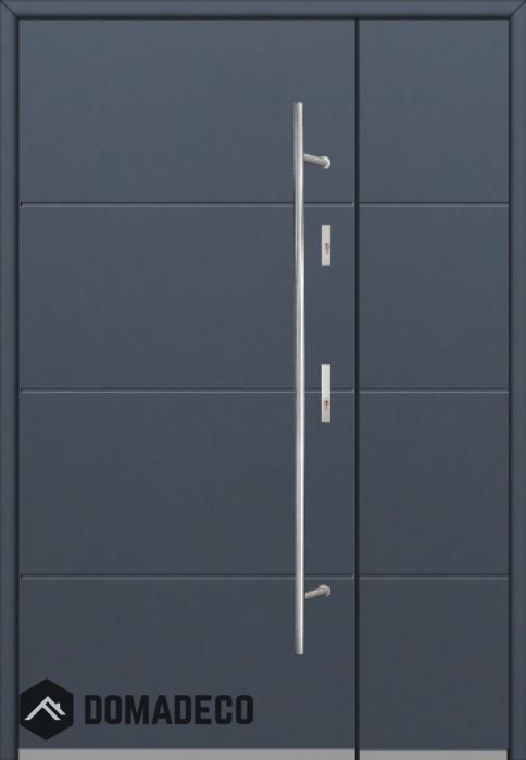 La puerta es de acero inoxidable. En el interior está rellena de espuma de poliuretano PUR y madera. El grosor de la hoja de la puerta es de 54 mm. Sistema de sellado dual: Un sello está en la parte inferior del marco y el otro está ubicado en la parte de soporte de la hoja de la puerta. Reducen la vibración y protegen su casa de la pérdida de calor. No cambian su volumen bajo la influencia de las condiciones atmosféricas. El marco de la puerta tiene refuerzos antirrobo en piezas de bisagra y puntos de bloqueo.