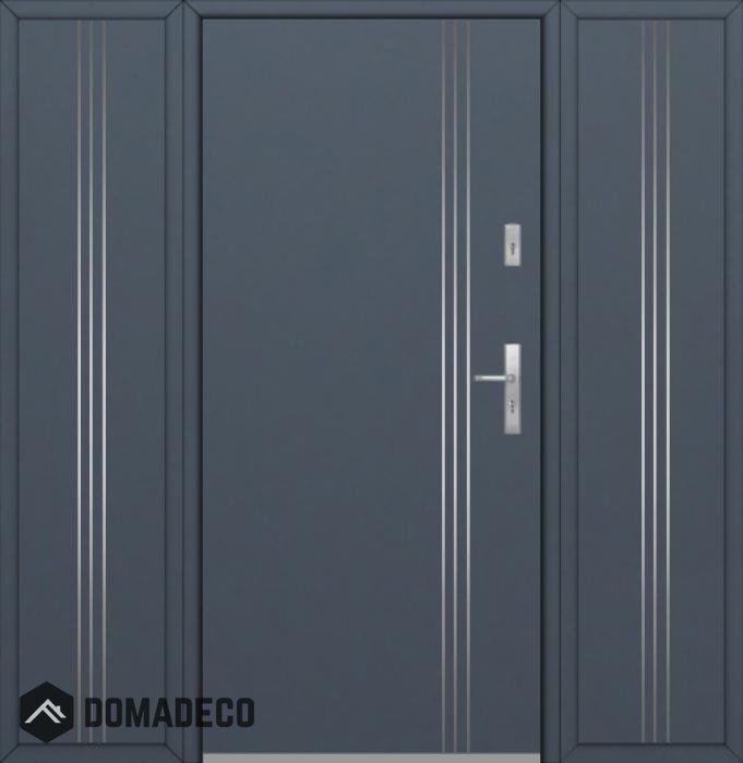 La puerta es de acero inoxidable. En el interior está rellena de espuma de poliuretano PUR y madera. El grosor de la hoja de la puerta es de 54 mm. Sistema de sellado dual: Un sello está en la parte inferior del marco y el otro está ubicado en la parte de soporte de la hoja de la puerta. Reducen la vibración y protegen su casa de la pérdida de calor. No cambian su volumen bajo la influencia de las condiciones atmosféricas. El marco de la puerta tiene refuerzos antirrobo en piezas de bisagra y puntos de bloqueo.