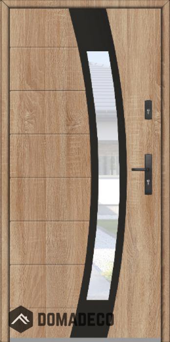 La puerta es de acero inoxidable. En el interior está rellena de espuma de poliuretano PUR y madera. El grosor de la hoja de la puerta es de 64 mm. Sistema de sellado dual: Un sello está en la parte inferior del marco y el otro está ubicado en la parte de soporte de la hoja de la puerta. Reducen la vibración y protegen su casa de la pérdida de calor. No cambian su volumen bajo la influencia de las condiciones atmosféricas. El marco de la puerta tiene refuerzos antirrobo en piezas de bisagra y puntos de bloqueo.
