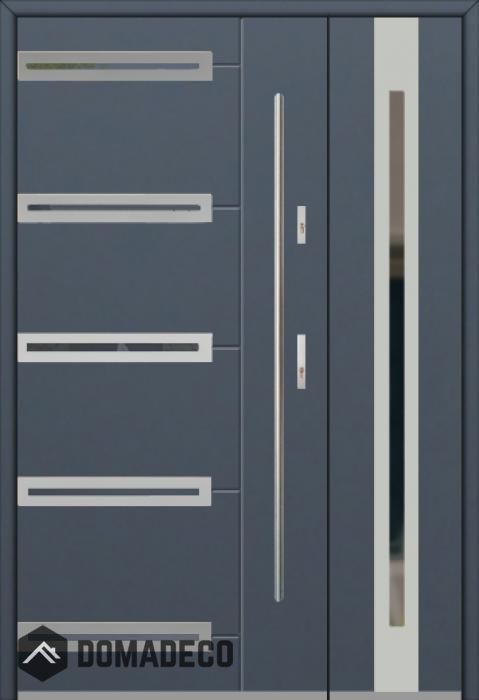 La puerta es de acero inoxidable. En el interior está rellena de espuma de poliuretano PUR y madera. El grosor de la hoja de la puerta es de 54 mm. Sistema de sellado dual: Un sello está en la parte inferior del marco y el otro está ubicado en la parte de soporte de la hoja de la puerta. Reducen la vibración y protegen su casa de la pérdida de calor. No cambian su volumen bajo la influencia de las condiciones atmosféricas. El marco de la puerta tiene refuerzos antirrobo en piezas de bisagra y puntos de bloqueo.
