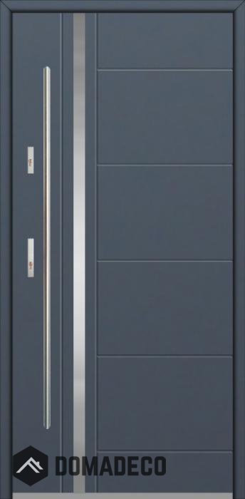 La puerta es de acero inoxidable. En el interior está rellena de espuma de poliuretano PUR y madera. El grosor de la hoja de la puerta es de 64 mm. Sistema de sellado dual: Un sello está en la parte inferior del marco y el otro está ubicado en la parte de soporte de la hoja de la puerta. Reducen la vibración y protegen su casa de la pérdida de calor. No cambian su volumen bajo la influencia de las condiciones atmosféricas. El marco de la puerta tiene refuerzos antirrobo en piezas de bisagra y puntos de bloqueo.