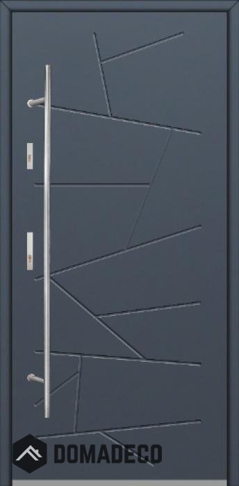 La puerta es de acero inoxidable. En el interior está rellena de espuma de poliuretano PUR y madera. El grosor de la hoja de la puerta es de 64 mm. Sistema de sellado dual: Un sello está en la parte inferior del marco y el otro está ubicado en la parte de soporte de la hoja de la puerta. Reducen la vibración y protegen su casa de la pérdida de calor. No cambian su volumen bajo la influencia de las condiciones atmosféricas. El marco de la puerta tiene refuerzos antirrobo en piezas de bisagra y puntos de bloqueo.
