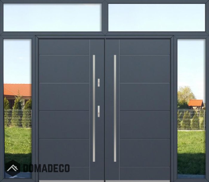 El juego de puertas incluye: - Puerta y marco de puerta con dos juntas; - Dos cerraduras independientes (mecanismo de bloqueo multipunto) que proporcionan soluciones de seguridad antirrobo; - Dos juegos de inserciones con las llaves; - Tirador de puerta normal (tirador largo con barra en T como opción adicional); - Visor (en el caso de puertas macizas); - 6 Bisagras ajustables (3 en cada lado) que proporcionan protección antirrobo; - Umbral de aluminio con junta; - 3 tornillos antirrobo.