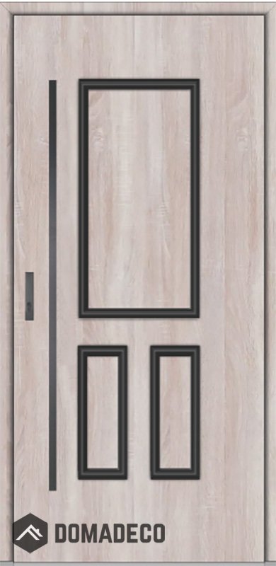 La puerta es de acero inoxidable. En el interior está rellena de espuma de poliuretano PUR y madera. El grosor de la hoja de la puerta es de 64 mm. Sistema de sellado dual: Un sello está en la parte inferior del marco y el otro está ubicado en la parte de soporte de la hoja de la puerta. Reducen la vibración y protegen su casa de la pérdida de calor. No cambian su volumen bajo la influencia de las condiciones atmosféricas. El marco de la puerta tiene refuerzos antirrobo en piezas de bisagra y puntos de bloqueo.