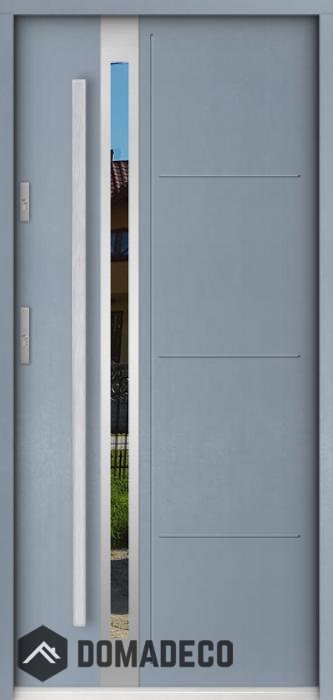 La puerta está hecha de acero inoxidable. En su interior está rellena de espuma de poliuretano PUR y madera. El grosor de la hoja de la puerta es de 55 mm. Posee un Sistema de Sellado Doble: Un sello se encuentra en la parte superior del marco y el otro en la parte de soporte de la hoja de la puerta. Reducen la vibración y protegen su casa de la pérdida de calor. No cambian su volumen bajo la influencia de las condiciones atmosféricas. El marco de la puerta tiene refuerzos antirrobo en partes de bisagras y puntos de cierre.