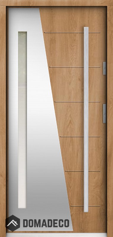La puerta está hecha de acero inoxidable. En su interior está rellena de espuma de poliuretano PUR y madera. El grosor de la hoja de la puerta es de 55 mm. Posee un Sistema de Sellado Doble: Un sello se encuentra en la parte superior del marco y el otro en la parte de soporte de la hoja de la puerta. Reducen la vibración y protegen su casa de la pérdida de calor. No cambian su volumen bajo la influencia de las condiciones atmosféricas. El marco de la puerta tiene refuerzos antirrobo en partes de bisagras y puntos de cierre.