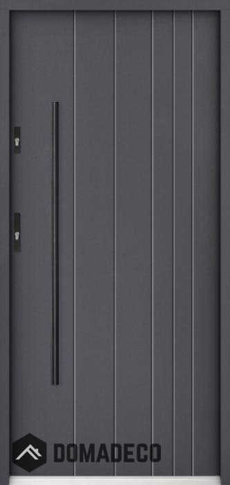 La puerta está hecha de acero inoxidable. En su interior está rellena de espuma de poliuretano PUR y madera. El grosor de la hoja de la puerta es de 55 mm. Posee un Sistema de Sellado Doble: Un sello se encuentra en la parte superior del marco y el otro en la parte de soporte de la hoja de la puerta. Reducen la vibración y protegen su casa de la pérdida de calor. No cambian su volumen bajo la influencia de las condiciones atmosféricas. El marco de la puerta tiene refuerzos antirrobo en partes de bisagras y puntos de cierre.