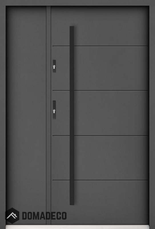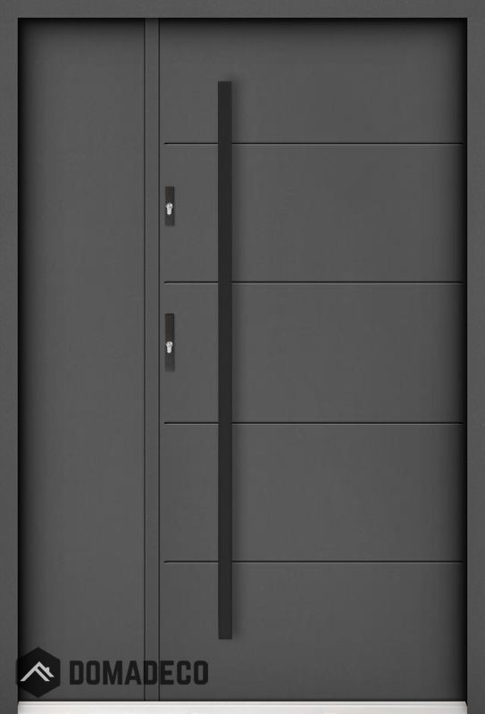 La puerta está hecha de acero inoxidable. En su interior está rellena de espuma de poliuretano PUR y madera. El grosor de la hoja de la puerta es de 55 mm. Posee un Sistema de Sellado Doble: Un sello se encuentra en la parte superior del marco y el otro en la parte de soporte de la hoja de la puerta. Reducen la vibración y protegen su casa de la pérdida de calor. No cambian su volumen bajo la influencia de las condiciones atmosféricas. El marco de la puerta tiene refuerzos antirrobo en partes de bisagras y puntos de cierre.