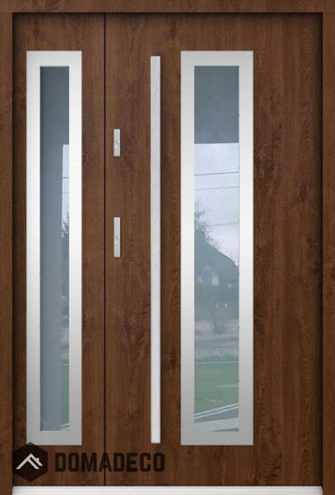 La puerta está hecha de acero inoxidable. En su interior está rellena de espuma de poliuretano PUR y madera. El grosor de la hoja de la puerta es de 55 mm. Posee un Sistema de Sellado Doble: Un sello se encuentra en la parte superior del marco y el otro en la parte de soporte de la hoja de la puerta. Reducen la vibración y protegen su casa de la pérdida de calor. No cambian su volumen bajo la influencia de las condiciones atmosféricas. El marco de la puerta tiene refuerzos antirrobo en partes de bisagras y puntos de cierre.