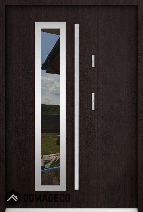 La puerta está hecha de acero inoxidable. En su interior está rellena de espuma de poliuretano PUR y madera. El grosor de la hoja de la puerta es de 55 mm. Posee un Sistema de Sellado Doble: Un sello se encuentra en la parte superior del marco y el otro en la parte de soporte de la hoja de la puerta. Reducen la vibración y protegen su casa de la pérdida de calor. No cambian su volumen bajo la influencia de las condiciones atmosféricas. El marco de la puerta tiene refuerzos antirrobo en partes de bisagras y puntos de cierre.