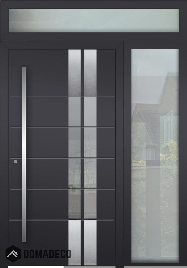Vista desde el exterior, la puerta batiente LIM de aluminio con un panel de cristal derecho y otro superior presenta una fachada visualmente impactante que llama la atención y añade un toque de elegancia al exterior de su hogar. La combinación de la puerta batiente con los paneles de cristal ofrece un aspecto contemporáneo y sin juntas que es a la vez funcional y estéticamente agradable. El panel de cristal derecho proporciona un elemento visual adicional, mientras que el panel de cristal superior permite que entre abundante luz natural en la entrada, haciendo que su hogar parezca abierto y acogedor.