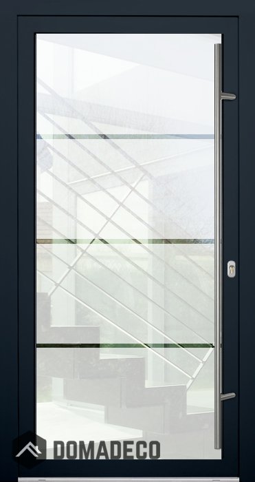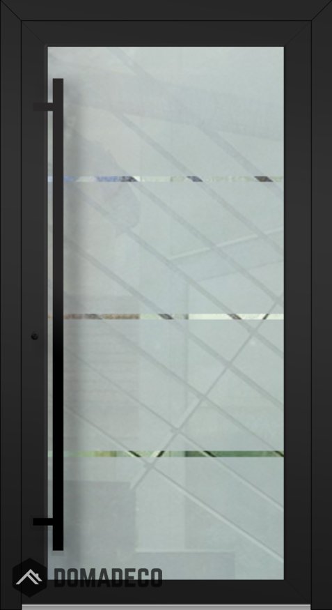 Las tres franjas horizontales transparentes que recorren toda la anchura de la puerta le aportan un elemento visual distintivo. Estas bandas de cristal transparente crean un elegante contraste con el fondo esmerilado, rompiendo la superficie e introduciendo capas de profundidad e interés. Las franjas transparentes permiten vislumbrar el interior o el exterior, creando una sutil conexión entre los espacios y manteniendo la privacidad. Esta característica de diseño única no solo realza el aspecto contemporáneo de la puerta, sino que también permite que la luz natural pase estratégicamente, iluminando la entrada y contribuyendo a una sensación más abierta y aireada.