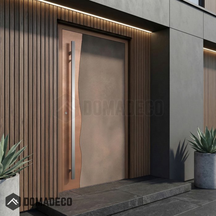 LIM M25 - puerta batiente de aluminio con metal líquido de cobre y bronce envejecido