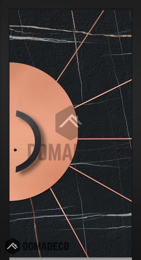 LIM Sahara: puerta abatible de aluminio revestida con cuarzo sinterizado Sahara Noir y lámina de cobre.