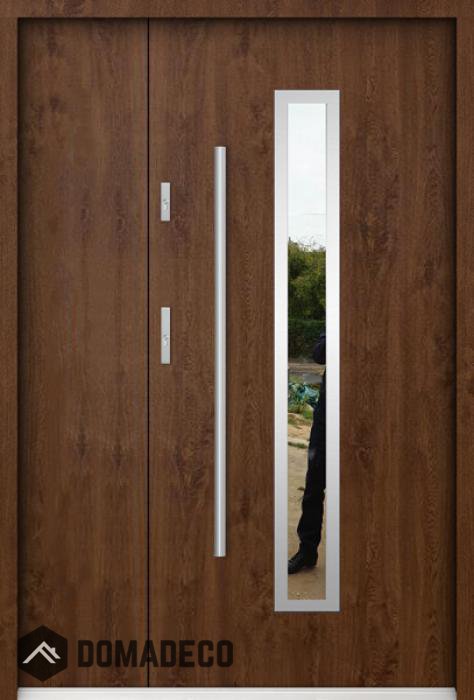 La puerta está hecha de acero inoxidable. En su interior está rellena de espuma de poliuretano PUR y madera. El grosor de la hoja de la puerta es de 55 mm. Posee un Sistema de Sellado Doble: Un sello se encuentra en la parte superior del marco y el otro en la parte de soporte de la hoja de la puerta. Reducen la vibración y protegen su casa de la pérdida de calor. No cambian su volumen bajo la influencia de las condiciones atmosféricas. El marco de la puerta tiene refuerzos antirrobo en partes de bisagras y puntos de cierre.