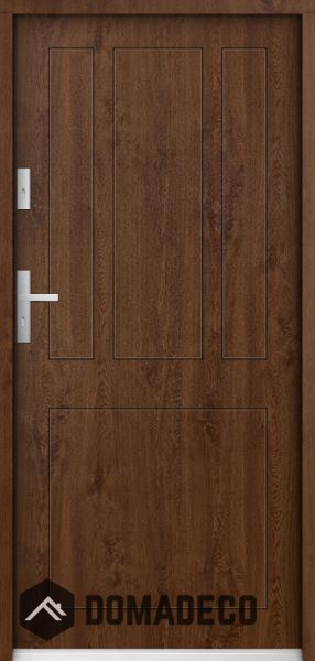 La puerta está hecha de acero inoxidable. En su interior está rellena de espuma de poliuretano PUR y madera. El grosor de la hoja de la puerta es de 55 mm. Posee un Sistema de Sellado Doble: Un sello se encuentra en la parte superior del marco y el otro en la parte de soporte de la hoja de la puerta. Reducen la vibración y protegen su casa de la pérdida de calor. No cambian su volumen bajo la influencia de las condiciones atmosféricas. El marco de la puerta tiene refuerzos antirrobo en partes de bisagras y puntos de cierre.