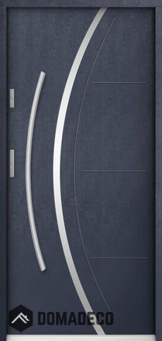 La puerta está hecha de acero inoxidable. En su interior está rellena de espuma de poliuretano PUR y madera. El grosor de la hoja de la puerta es de 55 mm. Posee un Sistema de Sellado Doble: Un sello se encuentra en la parte superior del marco y el otro en la parte de soporte de la hoja de la puerta. Reducen la vibración y protegen su casa de la pérdida de calor. No cambian su volumen bajo la influencia de las condiciones atmosféricas. El marco de la puerta tiene refuerzos antirrobo en partes de bisagras y puntos de cierre.