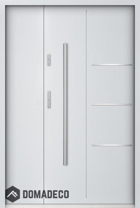 La puerta está hecha de acero inoxidable. En su interior está rellena de espuma de poliuretano PUR y madera. El grosor de la hoja de la puerta es de 55 mm. Posee un Sistema de Sellado Doble: Un sello se encuentra en la parte superior del marco y el otro en la parte de soporte de la hoja de la puerta. Reducen la vibración y protegen su casa de la pérdida de calor. No cambian su volumen bajo la influencia de las condiciones atmosféricas. El marco de la puerta tiene refuerzos antirrobo en partes de bisagras y puntos de cierre.