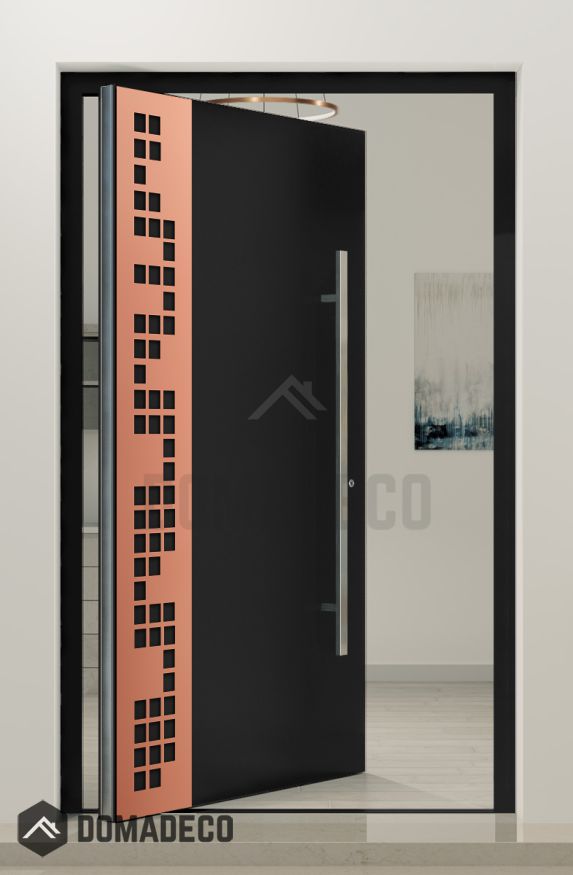 En resumen, la puerta pivotante de aluminio PIVOT C27, recubierta con una lámina de cobre y adornada con cuadrados recortados, es una obra maestra del diseño y la ingeniería. Ofrece una combinación armoniosa de durabilidad, funcionalidad y belleza artística, transformando cualquier entrada en una declaración de sofisticación y lujo moderno. Elija la PIVOT C27 para realzar su espacio con una puerta tan duradera y segura como visualmente cautivadora y única.