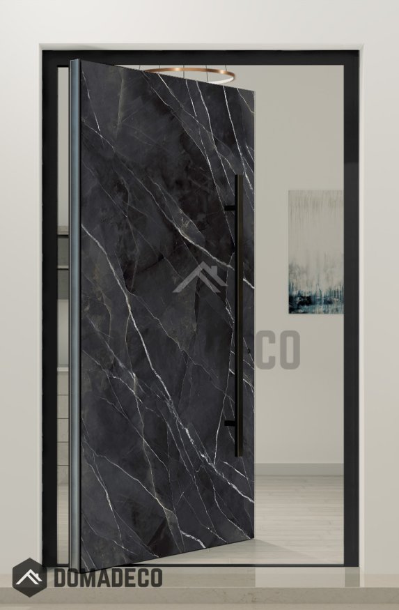 PIVOT Calacatta - puerta pivotante de aluminio revestida de cuarzo sinterizado Negro Calacatta