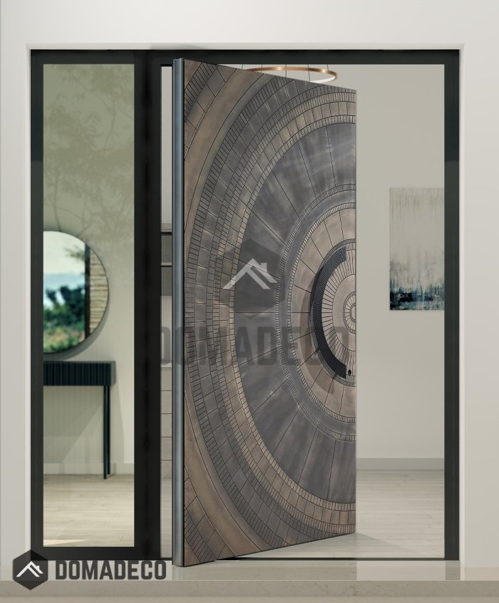 Como complemento de la puerta pivotante, la luz lateral izquierda adyacente ofrece un equilibrio armonioso a la composición general. Fabricada con la misma meticulosa atención al detalle, la luz lateral presenta una estética limpia y contemporánea, con un elegante marco de aluminio que rodea un amplio panel de cristal.