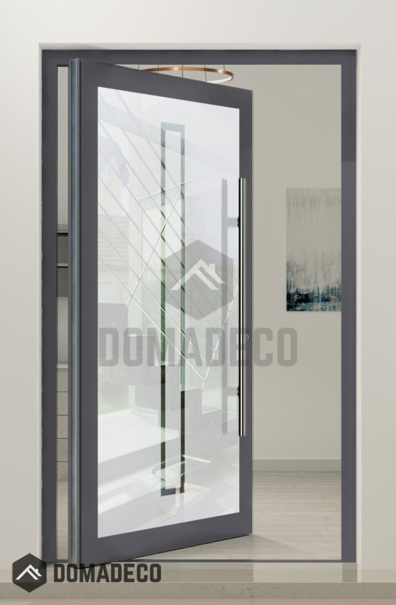 Tanto si prefiere un diseño moderno y minimalista como un estilo más contemporáneo y vanguardista, la puerta PIVOT Glass S2 con dos franjas transparentes ofrece versatilidad y flexibilidad para complementar sus preferencias estéticas únicas. Haga una declaración audaz con su entrada y transforme su hogar en un escaparate de elegancia moderna con la puerta pivotante esmerilada PIVOT Glass S2.