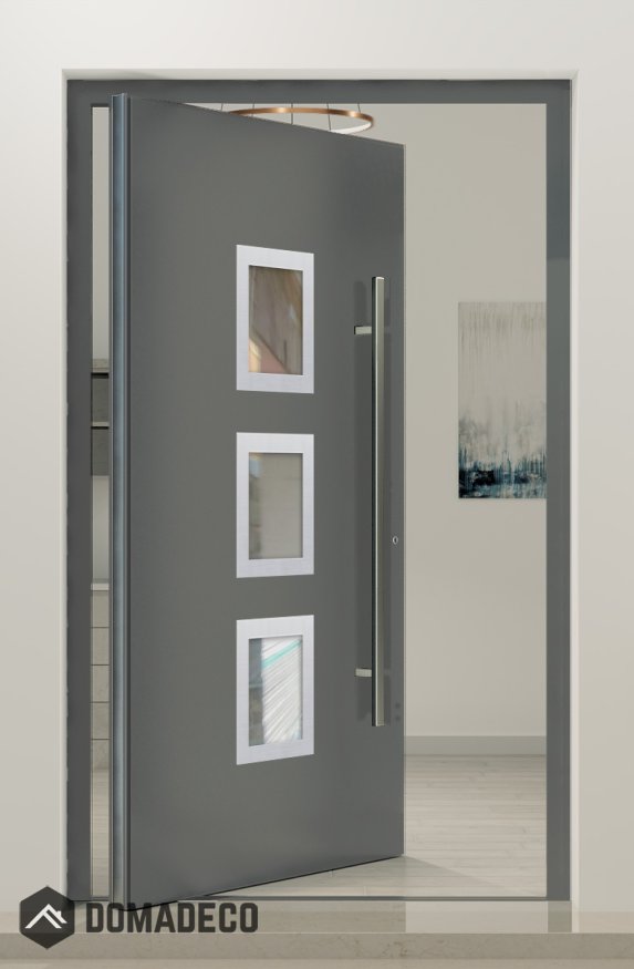 PIVOT Izobar: puerta de aluminio con un solo pivote y cinco ventanas.