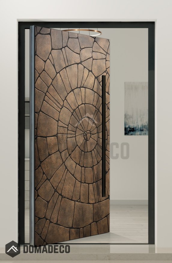 PIVOT M30: puerta pivotante de aluminio con textura marrón de metal fresado.