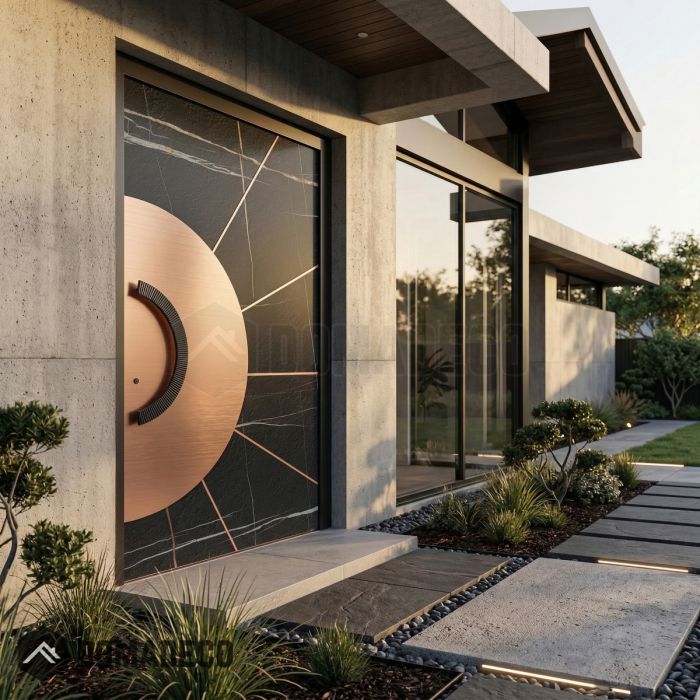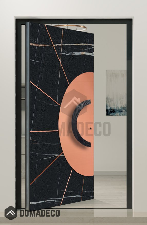 La puerta giratoria de aluminio PIVOT Sahara es un impresionante ejemplo de innovación arquitectónica moderna y artesanía refinada. Ha sido diseñada para causar una gran impresión y, al mismo tiempo, ofrecer una durabilidad y funcionalidad excepcionales. Esta puerta combina magistralmente un núcleo de aluminio resistente con dos lujosos materiales de acabado: el profundo y elegante cuarzo sinterizado Sahara Noir y la cálida y brillante lámina de cobre. Juntos, estos elementos crean una fascinante interacción de texturas y tonos que convierte cualquier entrada en un sofisticado punto de atracción.