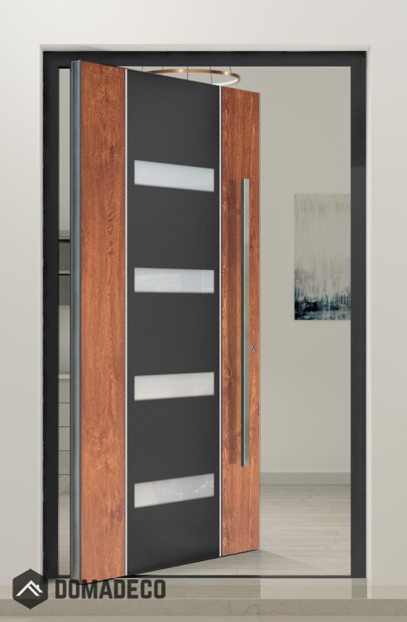 Ya sea instalada en una residencia moderna, un espacio comercial o una propiedad de lujo, la puerta pivotante de seguridad de aluminio PIVOT V09 causa una fuerte impresión con su combinación única de materiales y elementos de diseño. Los detalles decorativos en madera aportan un toque de sofisticación y encanto natural al elegante marco de aluminio, creando una entrada acogedora que marca el tono del espacio interior.