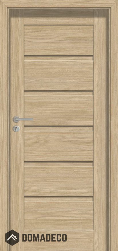 La puerta está hecha de un conjunto de rieles y montantes de MDF de alta calidad cubiertos con la superficie ECO TOP, SILKSTONE con grano de madera vertical. Los paneles tienen grano de madera horizontal. Patrones W03, W07, W08 con vetas de madera horizontales y patrones W05, W06 con verticales.