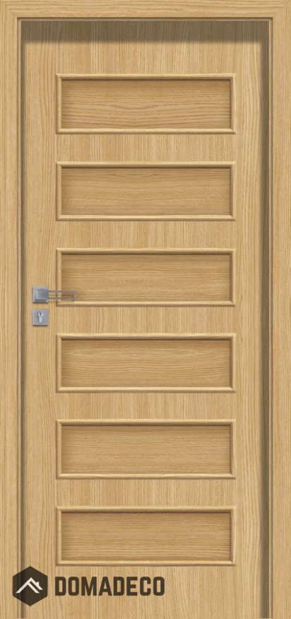 La puerta está hecha de un juego de rieles y estantes de madera con dos tableros de HDF al ras, cubiertos con una superficie ECO TOP, HIGH TOP. El núcleo está hecho de una capa estabilizadora en forma de panal.