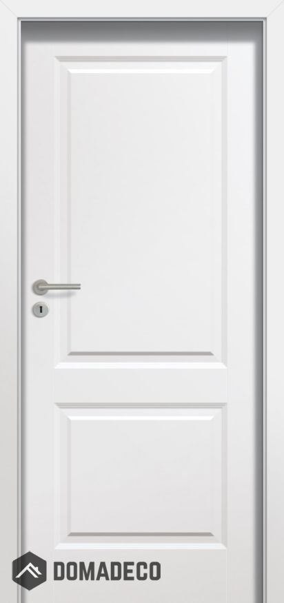 La puerta está hecha de un conjunto de rieles y montantes de madera con dos tableros de HDF al ras cubiertos con pintura acrílica ecológica (paleta de colores RAL y NCS).