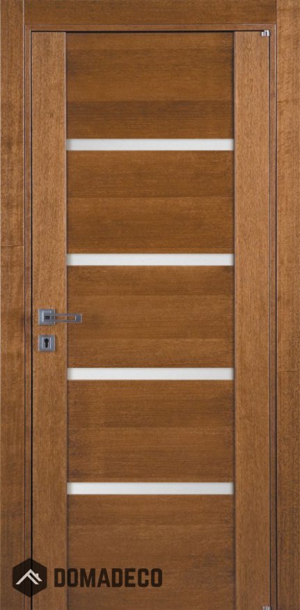 La puerta está hecha de un conjunto de rieles y montantes de madera con dos tableros de HDF al ras cubiertos con chapa natural o acabado superficial LAMISTONE CPL.