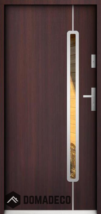 La puerta está hecha de acero inoxidable. En su interior está rellena de espuma de poliuretano PUR y madera. El grosor de la hoja de la puerta es de 55 mm. Posee un Sistema de Sellado Doble: Un sello se encuentra en la parte superior del marco y el otro en la parte de soporte de la hoja de la puerta. Reducen la vibración y protegen su casa de la pérdida de calor. No cambian su volumen bajo la influencia de las condiciones atmosféricas. El marco de la puerta tiene refuerzos antirrobo en partes de bisagras y puntos de cierre.