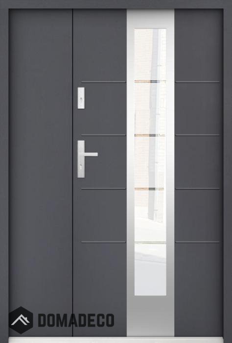 La puerta está hecha de acero inoxidable. En su interior está rellena de espuma de poliuretano PUR y madera. El grosor de la hoja de la puerta es de 55 mm. Posee un Sistema de Sellado Doble: Un sello se encuentra en la parte superior del marco y el otro en la parte de soporte de la hoja de la puerta. Reducen la vibración y protegen su casa de la pérdida de calor. No cambian su volumen bajo la influencia de las condiciones atmosféricas. El marco de la puerta tiene refuerzos antirrobo en partes de bisagras y puntos de cierre.