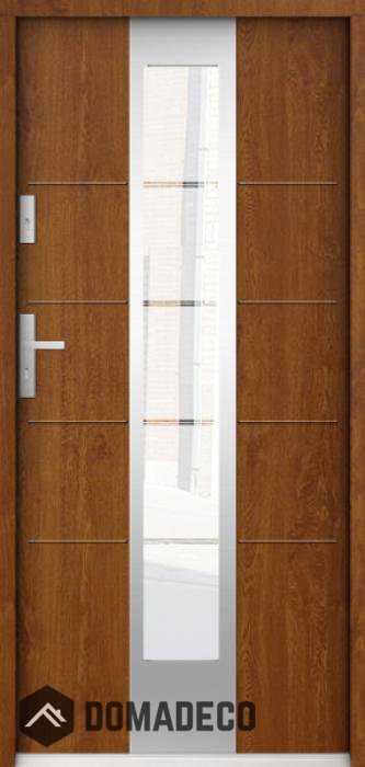 La puerta está hecha de acero inoxidable. En su interior está rellena de espuma de poliuretano PUR y madera. El grosor de la hoja de la puerta es de 55 mm. Posee un Sistema de Sellado Doble: Un sello se encuentra en la parte superior del marco y el otro en la parte de soporte de la hoja de la puerta. Reducen la vibración y protegen su casa de la pérdida de calor. No cambian su volumen bajo la influencia de las condiciones atmosféricas. El marco de la puerta tiene refuerzos antirrobo en partes de bisagras y puntos de cierre.