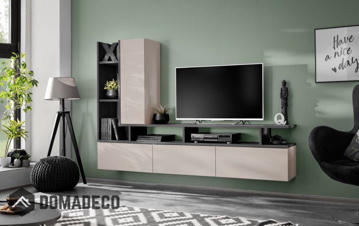 Distribución: armario alto con estantes, estantes abiertos, mueble para TV con frentes abatibles