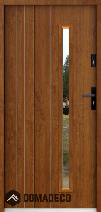 La puerta está hecha de acero inoxidable. En su interior está rellena de espuma de poliuretano PUR y madera. El grosor de la hoja de la puerta es de 55 mm. Posee un Sistema de Sellado Doble: Un sello se encuentra en la parte superior del marco y el otro en la parte de soporte de la hoja de la puerta. Reducen la vibración y protegen su casa de la pérdida de calor. No cambian su volumen bajo la influencia de las condiciones atmosféricas. El marco de la puerta tiene refuerzos antirrobo en partes de bisagras y puntos de cierre.