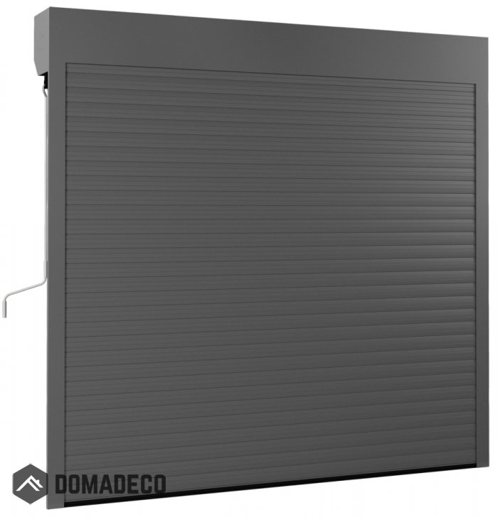 La puerta de garaje enrollable está pensada para su uso en viviendas unifamiliares y cuartos de servicio. La puerta está fabricada con perfil de aluminio AW 77 relleno de espuma de poliuretano sin freón. La puerta está provista de perfiles verticales de aluminio y de una caja o una cubierta parcial del eje de enrollamiento. La persiana de la puerta se enrolla en un eje situado en el dintel, desde el interior del edificio. La puerta está equipada con un accionamiento tubular monofásico, un interruptor para accionar la puerta y una manivela para la apertura de emergencia. La puerta está sellada por todos los lados. La puerta se puede instalar en el interior o en el exterior del local. La puerta está disponible sólo en versión de accionamiento eléctrico.
